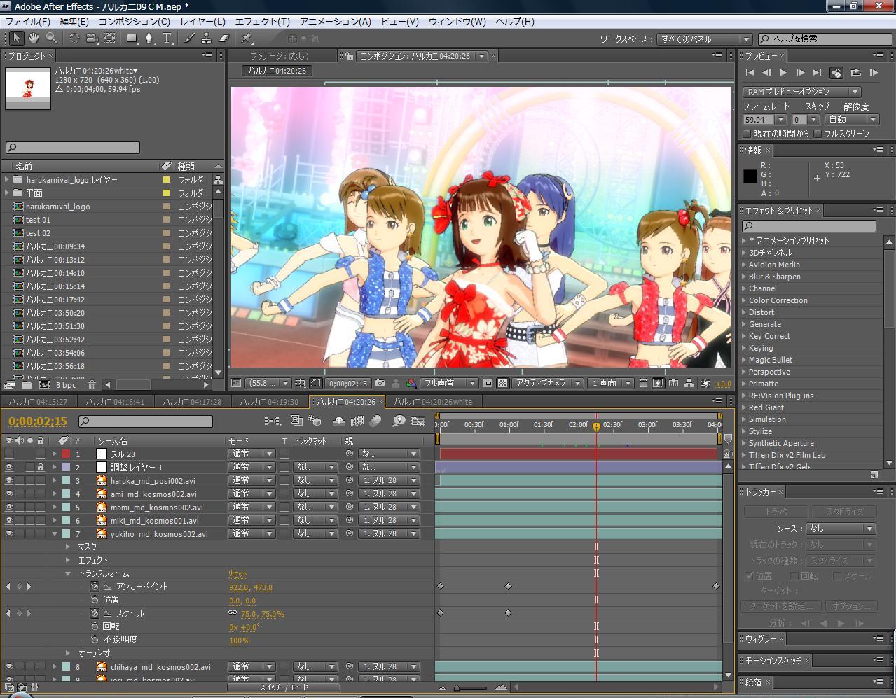 前回更新の時に少し触れましたが、某イベントことハルカニ2009<http://haruka.imasevent.com/>の本放送が来週と迫ってまいりました。自分としては本編は不参加なのに、ひょんなことから協賛CMを作ることになりましたが、とりあえず絵コンテを組み終えたので、今週末からキャプチャ⇒素材加工⇒繋ぎのサイクルに入りました(間に合うのか?)。さすがに11人全員登場させるのは骨が折れますね。一曲約2分x2(再生+キャプチャ)として、11人分+野外ステージバックで、全員キャプチャーするには軽く1時間超えます。製作者は汗だくになってますが、夏の暑さを吹き飛ばすべく元気一杯にステージを駆け巡る「春香&765工房オールスターズ(謎)」が表現できればいいなあ・・・